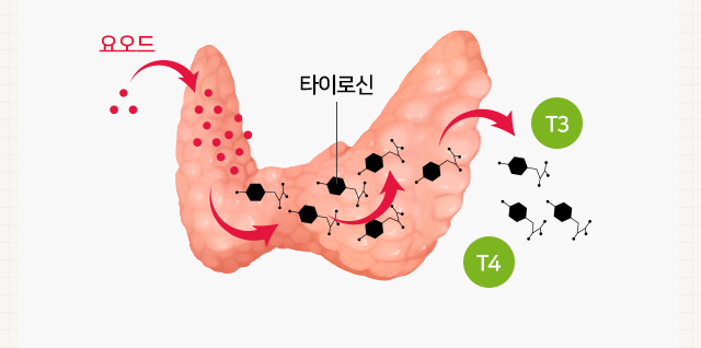 갑상선에는 요오드를 재료로 하여 갑상선호르몬 (T3, T4)을 만듭니다.