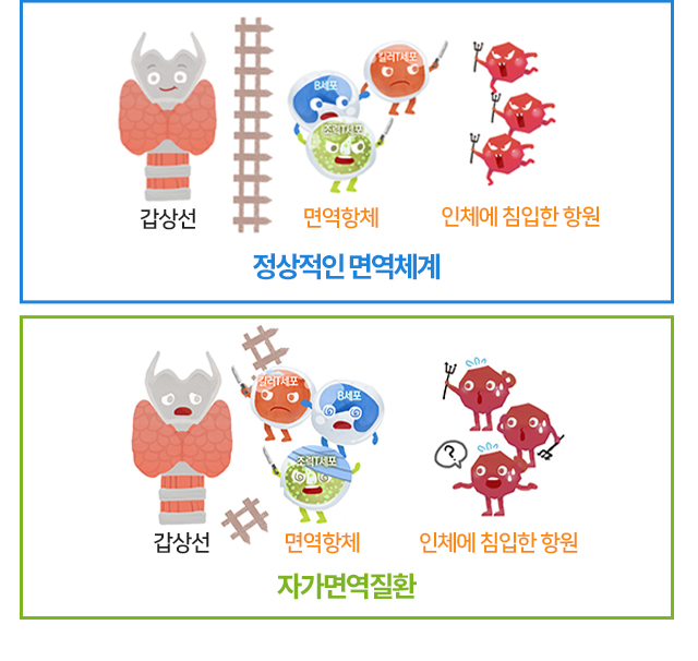 면역세포가 갑상선을 공격하여서 파괴하는 면역질환이기 때문에