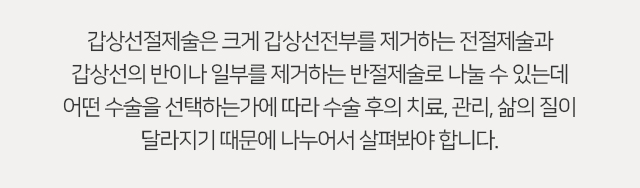 갑상선 수술은 크게 갑상선 전부를 제거하는 전절제술과 반이나 일부를 제거하는 반절제술로 나눠 진행됩니다.