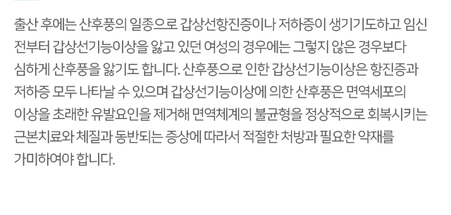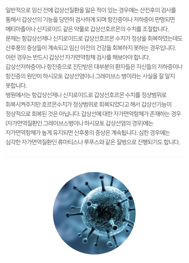 정상범위를 유지한다고 하더라도 산후풍의 증상이 계속된다면 갑상선에 대한 자가면역항체 검사를 해보아야 합니다.