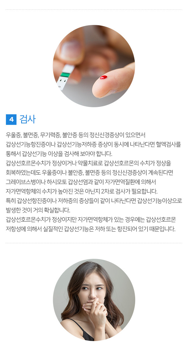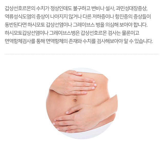 호르몬의 수치가 정상이라도 자가면역항체의 수치가 높은 경우에는 체중감량, 우울증, 탈모, 관절통, 수족냉증, 무기력증,