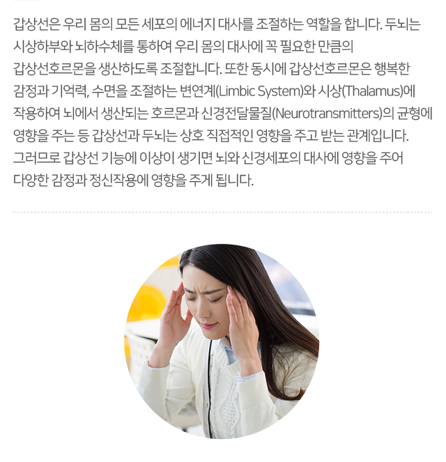 정신신경증상들이 나타나며 저하증의 경우에는 우울증, 무기력증, 건망증, 기면증등 주로 뇌신경의 활동이 저하되어서